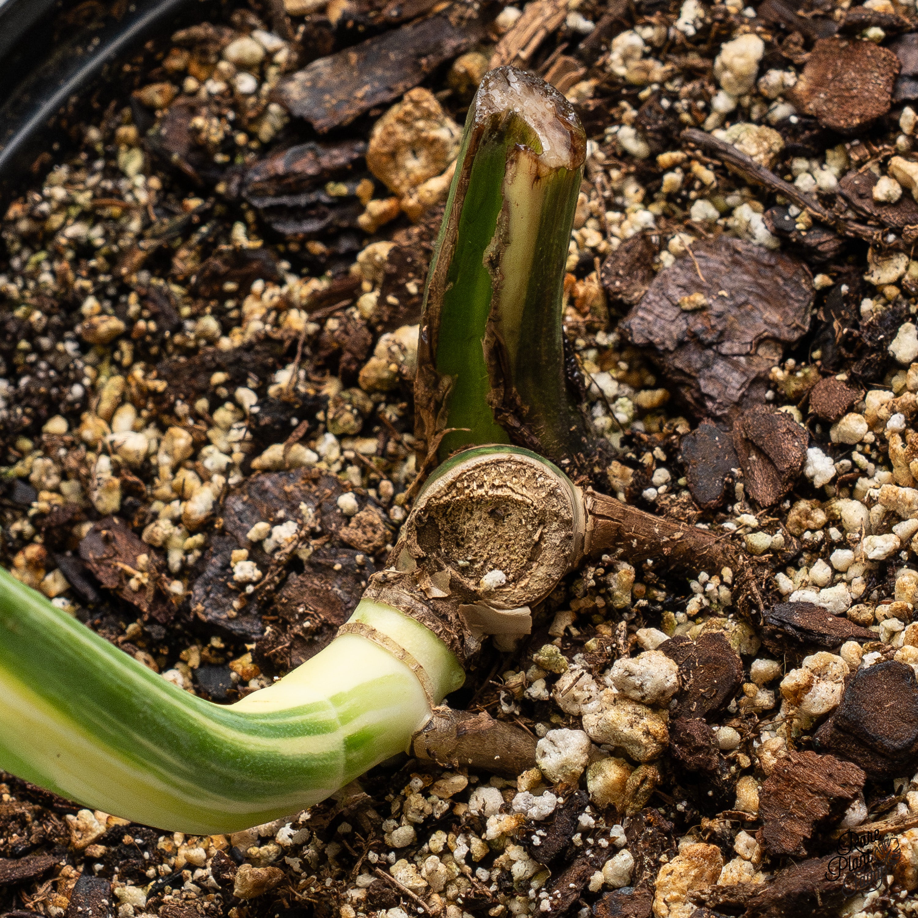 Monstera deliciosa Albo Variegated (Brazilian Form), also known as the intermediate form, is a rare variegated selection distinguished by its larger leaf size and deeper fenestrations that form closer to the midline of the leaf. In this form, mint variegation is far more commonly seen, making true albo variegation notably scarce. The leaves are broader and more substantial than small form or Borsigiana, while still maintaining a climbing growth habit rather than a self-heading one. Variegation appears as irregular white to cream sectors caused by reduced chlorophyll, with each leaf developing unique patterning. This form benefits from a support pole to encourage proper climbing and mature leaf development and grows best in bright, indirect light with evenly moist, well-draining soil.