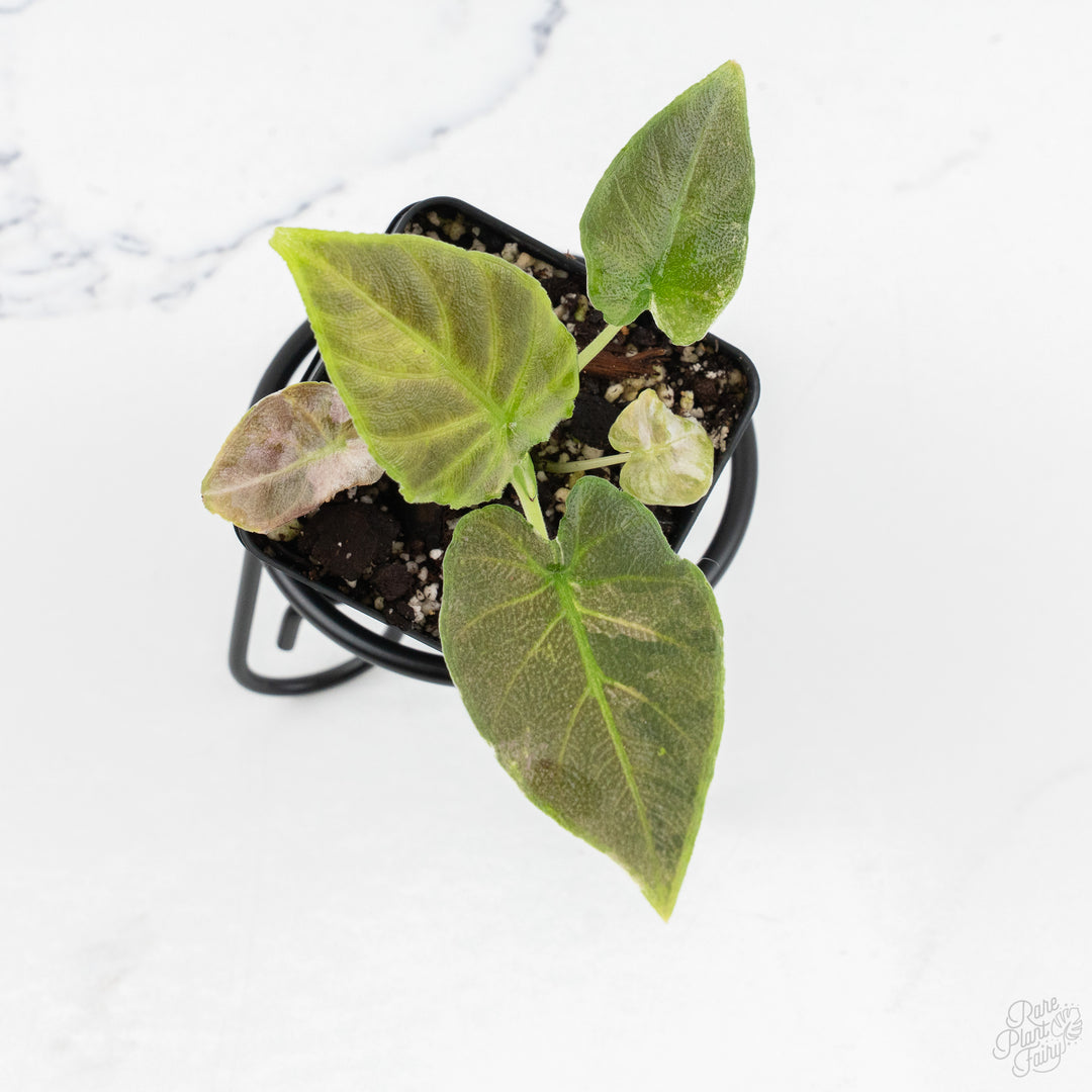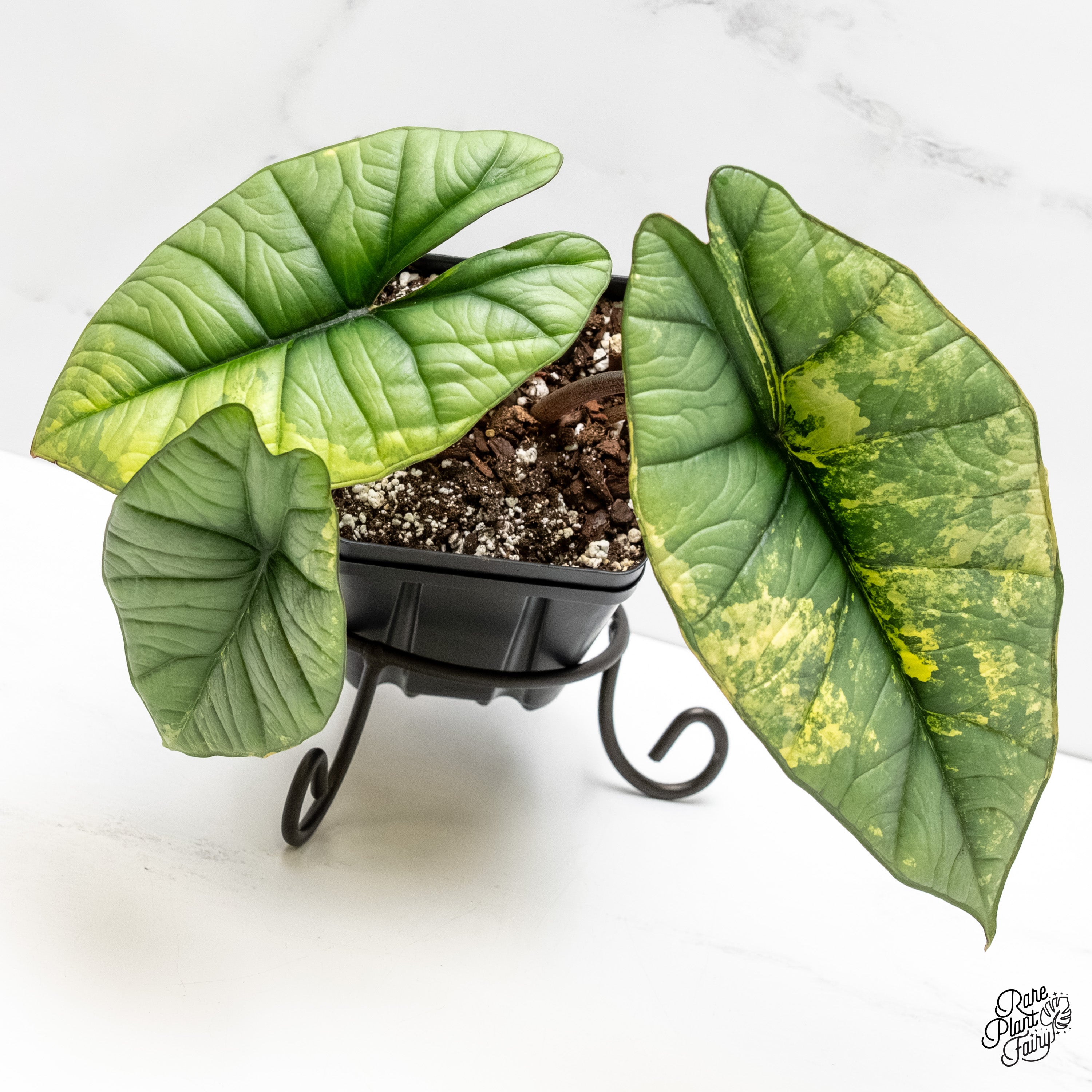 Alocasia ‘Bisma Platinum’ Aurea / Green Variegated is a rare variegated selection of Alocasia ‘Bisma Platinum’ prized for its thick, rounded leaves and smooth, matte surface. The foliage has a cool platinum-gray to blue-green base with layered variegation expressed in softer green and aurea tones, creating a muted, tonal pattern rather than high-contrast striping. Variegation appears as marbling and blended patches that complement the plant’s naturally subdued coloration. This cultivar maintains a compact, upright growth habit and grows best in bright, indirect light with evenly moist, well-draining soil and warm, stable conditions.
